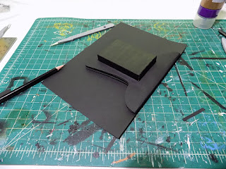 Paint the shrine front and Chipboard Top Hat Blank. Trace around one of the pieces onto black cardstock, then fold the piece over and trace around again. Cut out. Trace around just the shrine front on a second piece of cardstock. This will later be used as the outside cover.