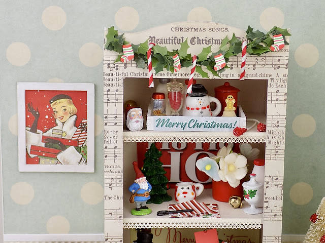 I've hung a festive garland along the top, used the lid to a 1-5/8 Inch Suitcase as a tray, and then proceeded to fill the shelves with teensy cute things like the Ceramic Snowman Tea Set.